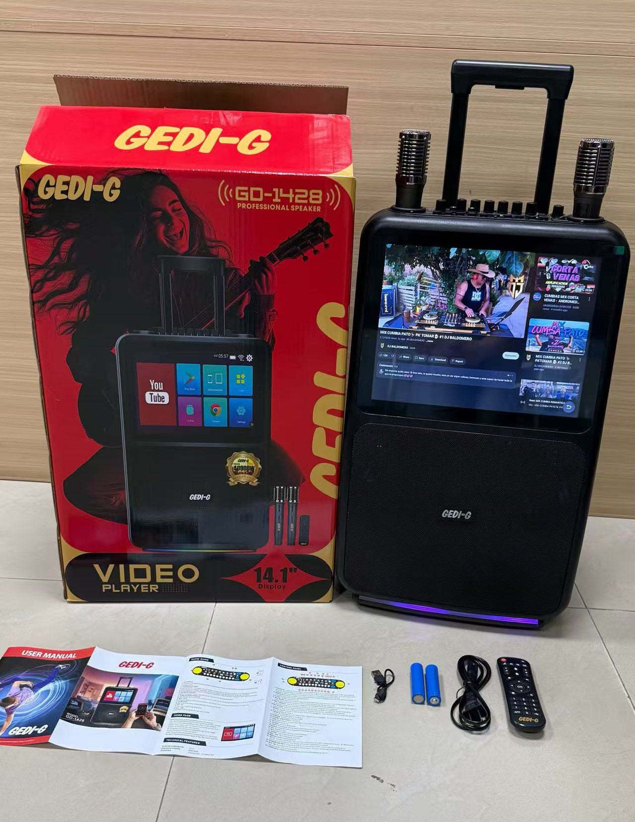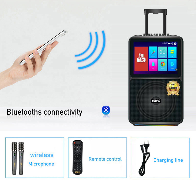 Built in 14.1 inch Touch Screen Pad, All in one Karaoke machine, Bluetooth party box speaker, 10" bass. Come with 2 x wireless microphone.